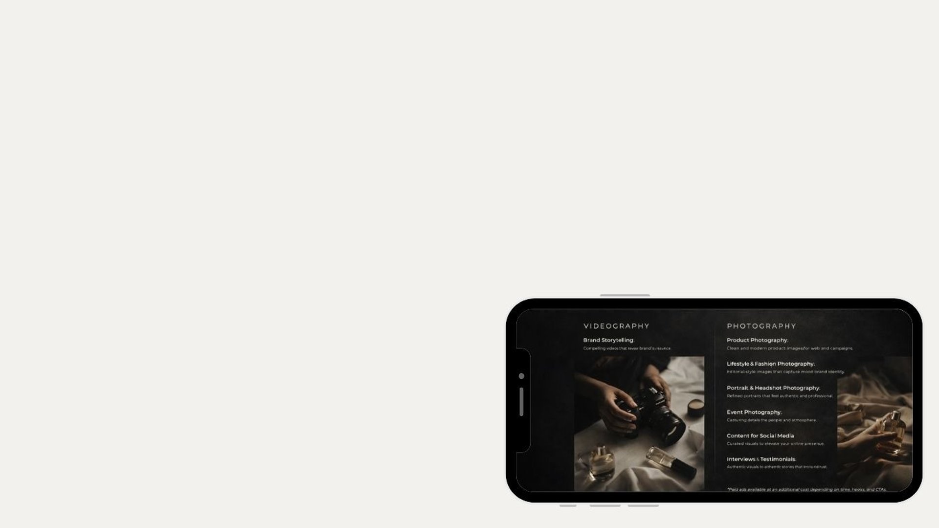 I offer high-quality visual content designed to elevate your brand, tell your story, and connect authentically with your audience. With over 9 years of experience, my approach blends strategy, storytelling, and refined aesthetics.